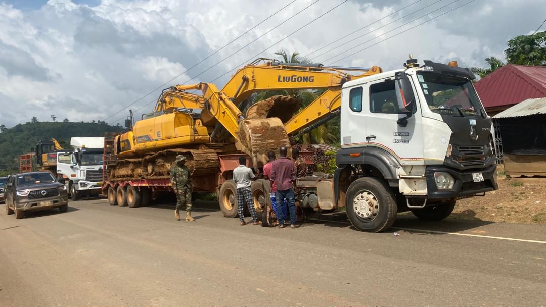 The operation opened at Akwadum, where officers moved in on an illegal mining site located close to the Birim River. Five (5) excavators were secured during the raid. Three (3) of the excavators were loaded onto low bed trucks and transported under armed escort to Accra, while two (2) others were immobilised on site to prevent further use. The action immediately brought mining activity in the area to a halt and sent operators fleeing into surrounding bushland.